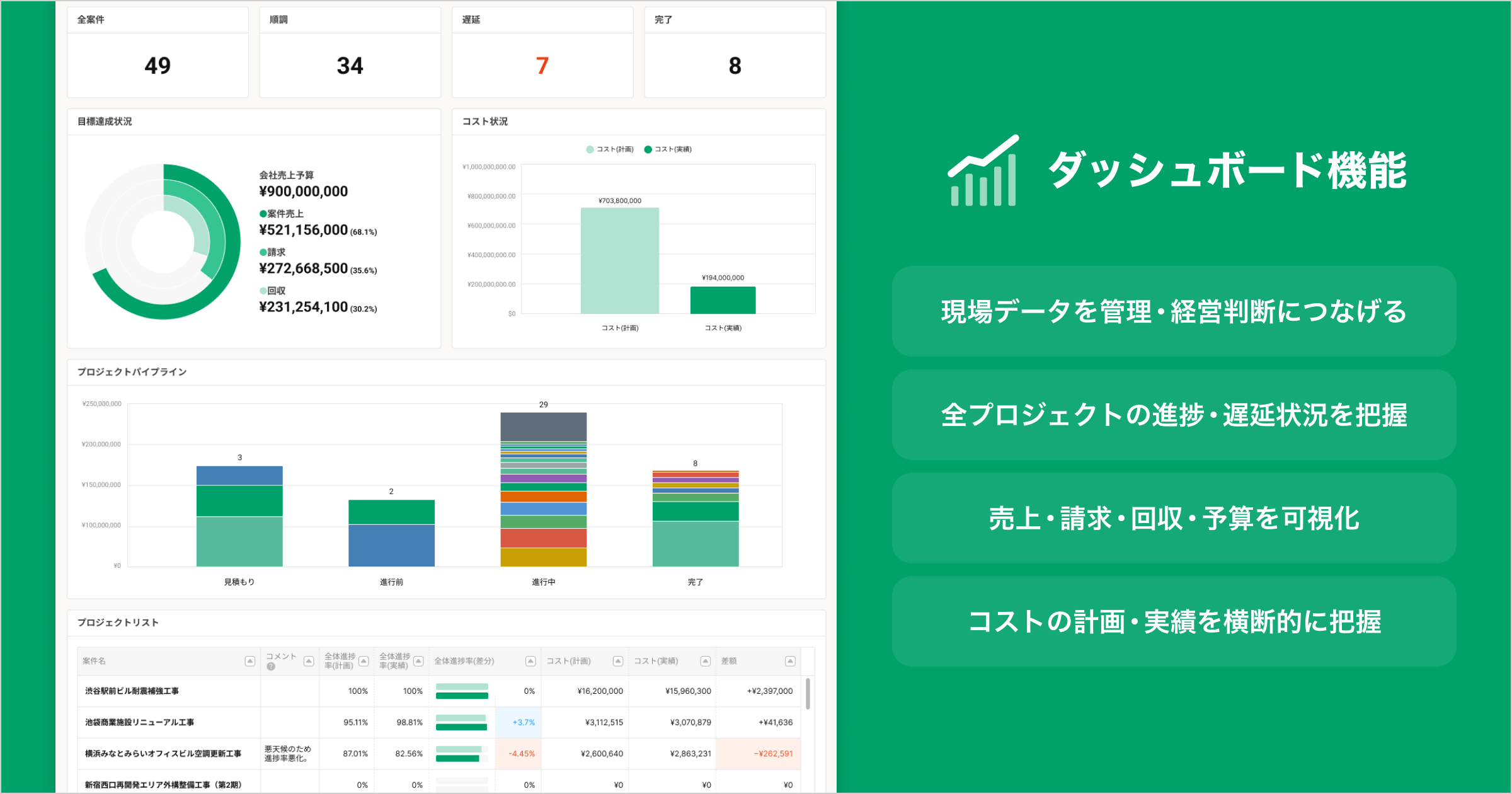 全案件を「順調」「遅延」「完了」といったステータス別に集計・表示。案件ごとの進捗率も確認でき、遅延している案件やコストオーバーしている案件など、どの案件に対応すべきかを視覚的に判断できます。2.売上・請求・回収・予算の関係を一画面で可視化