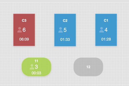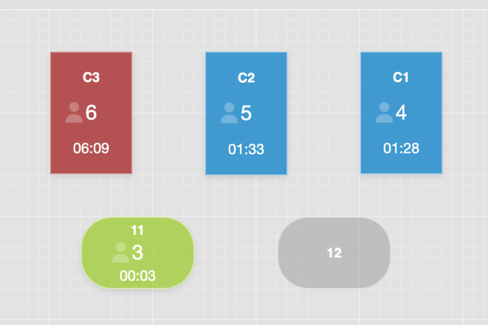 1)滞在時間表示+色分けで、サービスの“気づき”を強化着席からの滞在時間を表示し、一定時間を超えるとテーブル色が変化。長時間滞在や、未注文・会計待ちの席など、対応の優先度が高い席をひと目で把握することができます。これにより、声がけ・追加オーダー提案・会計誘導など、状況に応じたフォローを行いやすくなり、待ち時間ストレスの低減にも寄与します。