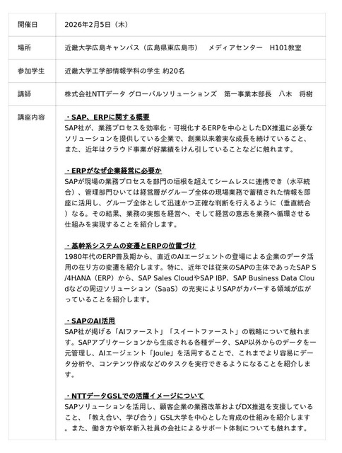 株式会社NTTデータ グローバルソリューションズ(本社:東京都中央区、代表取締役社長:木村 千彫、以下 NTTデータGSL)と、近畿大学工学部情報学科(所在地:広島県東広島市、学科長:古川 亮)は共同で、デジタル人財を育成する産学連携の取り組みを開始しました。取り組みの第一弾として、2025年11月に近畿大学工学部情報学科の学生向けに、DX推進に必要な統合基幹業務システム(ERP)・SAP注1の基礎を紹介する講座を実施しました。