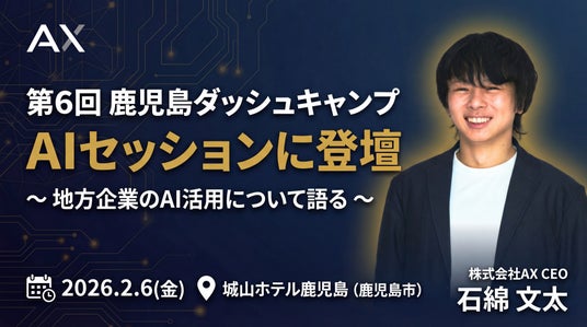 株式会社AX(所在地:福岡県福岡市、代表取締役:石綿 文太)は、2026年2月6日(金)に鹿児島県鹿児島市で開催される「第6回 鹿児島ダッシュキャンプ」のパネルディスカッション4【AIセッション】に代表の石綿が登壇することをお知らせいたします。