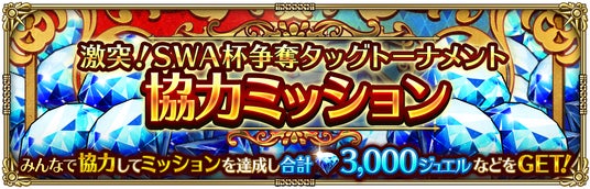 期間限定イベント「激突!SWA杯争奪タッグトーナメント」で獲得できるレッドマスク、ブルーマスクを集めて、みんなで協力して全体ミッションを達成しましょう。ミッションクリアで、合計3,000ジュエルなどの報酬を獲得できます。