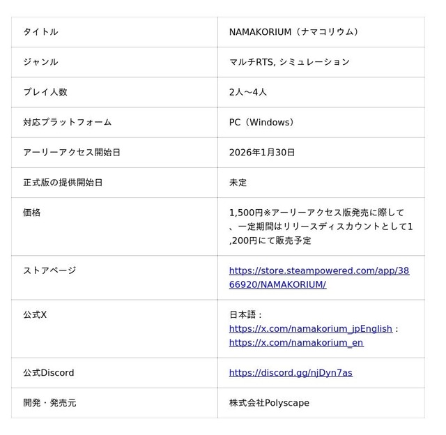 「未来を、前倒す。」をミッションとする株式会社Polyscape(本社:東京都港区、代表取締役:島田寛基、以下「当社」)は、海の掃除屋「ナマコ」が主役のカジュアルマルチプレイRTS「NAMAKORIUM(ナマコリウム)」のアーリーアクセス版提供をSteamで開始すると共に、定価1500円から2週間限定のリリースディスカウントとして、1200円で販売することをお知らせいたします。さらに、当社の第一作目であるリアルタイム・3Dローグライトアクション「MISTROGUE(ミストローグ)」も、NAMAKORIUMアーリーアクセス開始記念として、歴代最高の値下げ幅 75%OFFとなる1週間の割引セールを、2月3日から2月10日の7日間で実施いたします。
