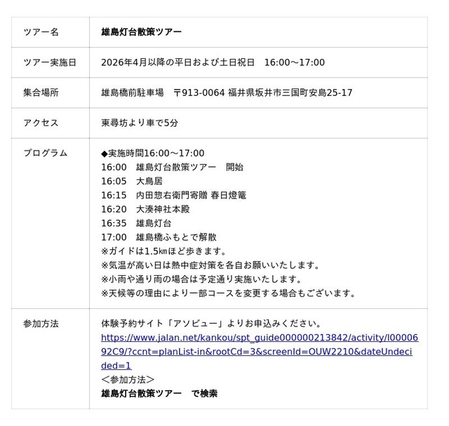 雄島地区灯台利活用プロジェクトコンソーシアムでは、約半年間をかけて地元ガイドと連携しながら、雄島灯台と雄島に伝わる神話「モックリコックリ」を題材にした散策ツアーを開発。2026年4月より福井を訪れる観光客を対象にツアー受入れを開始。現在、ツアーの予約を体験予約サイト「アソビュー」より受け付けています。本事業は、日本財団「海と日本プロジェクト」の一環として、灯台を中心に地域の海の記憶を掘り起こし、地域と地域、異分野と異業種、日本と世界をつなぎ、新たな海洋体験を創造していく「海と灯台プロジェクト」の助成を受けて実施します。