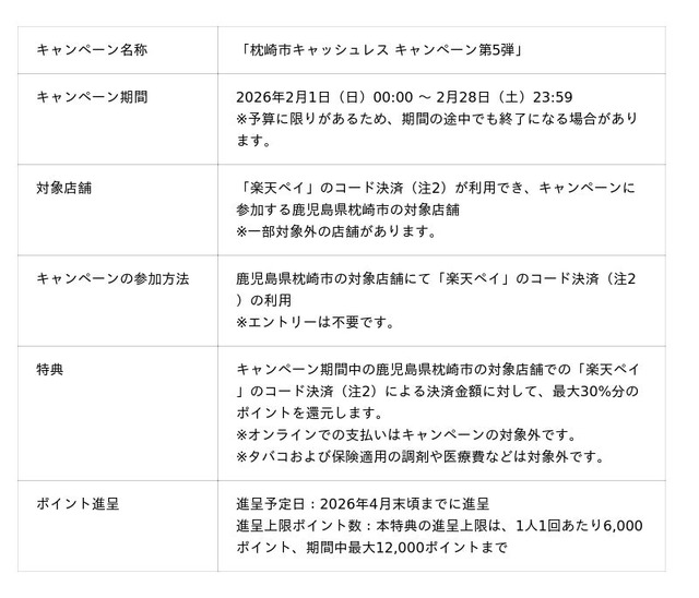本キャンペーンでは、鹿児島県枕崎市の対象店舗(注1)において、キャンペーン期間中に「楽天ペイ」のコード決済(注2)を利用した方を対象に、決済金額に対して最大30%分の「楽天ポイント」を還元(注3)します。