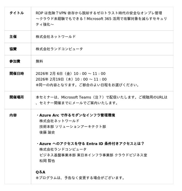 2026年2月6日(金)と2月19日(木)の2回、株式会社ランドコンピュータ(本社:東京都港区)は、Webセミナー「RDP は危険?VPN 依存から脱却するゼロトラスト時代の安全なオンプレ管理~クラウド未経験でもできる!Microsoft 365 活用で攻撃対象を減らすセキュリティ強化~」を共催いたします。