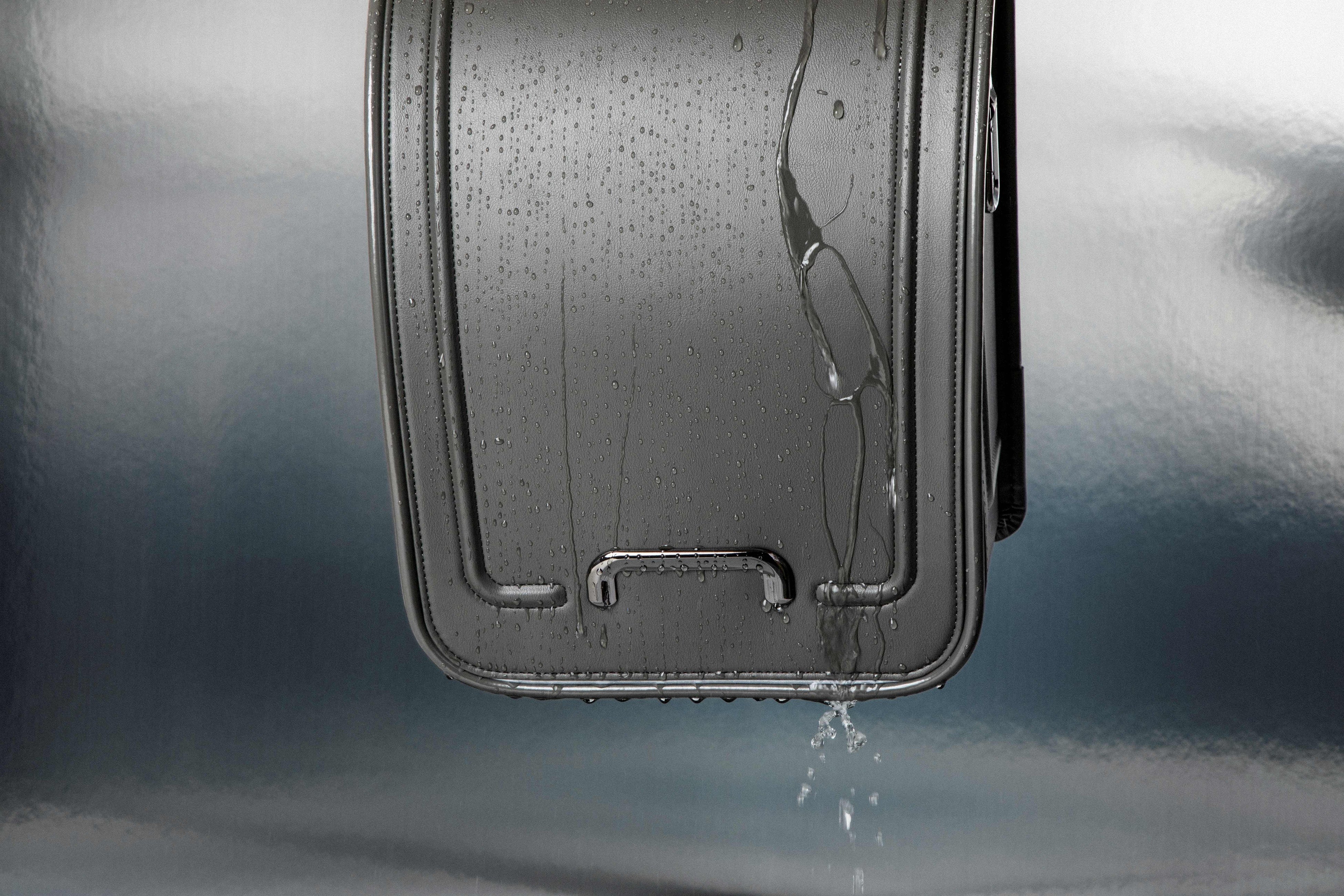 本体は防水素材(ポリエステル製は撥水)、360°の反射材つき。小さなお子さまにも使いやすいよう、左右側面のカラビナと、自動ロック錠前を採用しました。