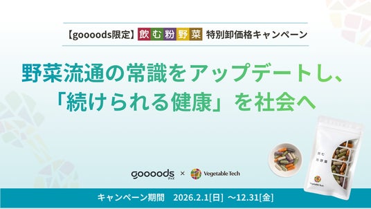 ベジタブルテック株式会社(本社:大阪市中央区、代表取締役:岩崎 真宏)は、 卸売プラットフォームを運営するgoooods株式会社(本社:東京都新宿区、代表取締役:菅野 圭介)と共同で、国産野菜パウダー商品「飲む粉野菜」を対象とした特別卸価格割引キャンペーンを開催いたします。