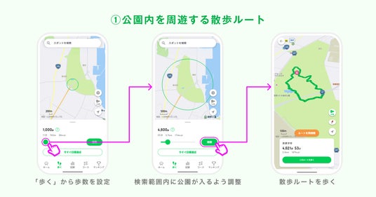 1.「散歩ルート」検索時に、公園内を周遊するルートの検索が可能に「歩く」タブから検索できる「散歩ルート」にて、公園内を対象範囲として検索すると、公園内を周遊する散歩ルートを検索できるようになります。