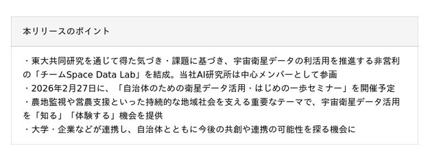 当社は、2022年から東京大学大学院工学系研究科 航空宇宙工学専攻 中須賀・船瀬・五十里研究室と「宇宙衛星データ×AI」及び「宇宙IT人材開発」をテーマに共同研究を進めています。本共同研究の一環として、東大生・院生向け講義や中高生向けセミナー、学会発表等を進める中、宇宙衛星データ活用の立ち上げには、これまで以上にビジネス抜きの伴走が必要との共通認識のもと、今般、東京大学の中須賀真一教授、Oppofieldsの向井田明COO・CTO、当社AI研究所が中心となり、「チームSpace Data Lab」を結成いたしました。
