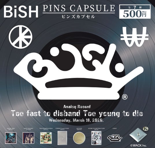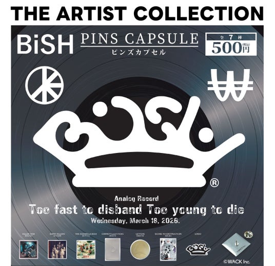 このたびシリーズの最新作として、2023年6月に解散した伝説のガールズグループ「BiSH」のピンズカプセルトイの発売が決定しました!今回発売するカプセルトイは、2026年3月18日(水)に発売が決定した「BiSH」の歴史を追った数量限定のアナログレコード『Too fast to disband Too young to die』のリリースを記念して企画されたものです。