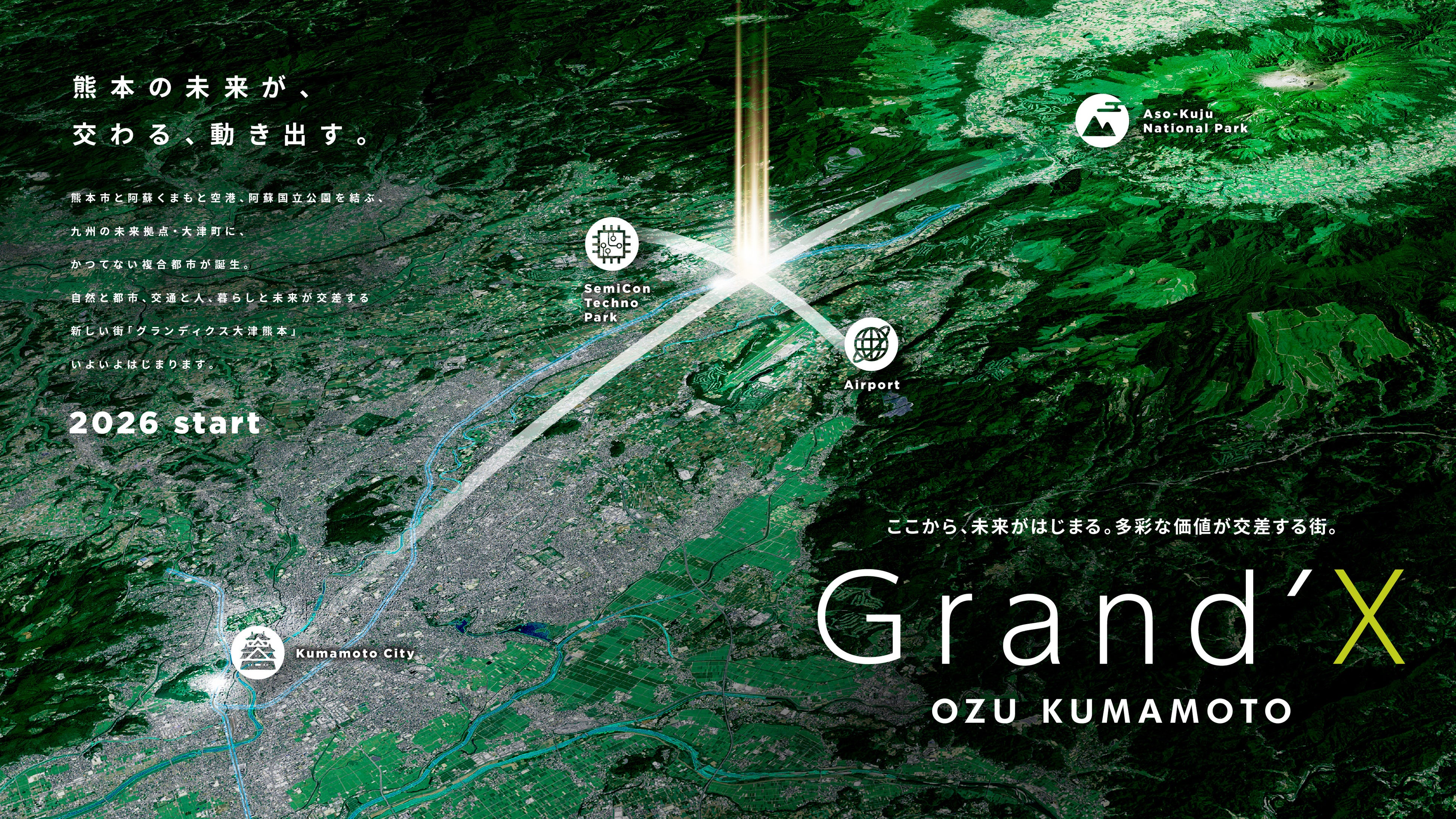 「Grand’X 大津熊本」は、阿蘇くまもと空港からのアクセスが良好な本計画地において、人・モノ・文化・情報が交わる複合拠点としての役割と可能性を表現するプロジェクト名称です。