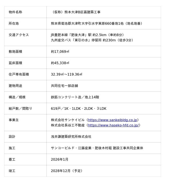また本プロジェクトの第1弾として、全619邸の大規模賃貸レジデンス開発事業「(仮称)熊本大津B区画建築工事」を着工いたしましたので、あわせてお知らせいたします。