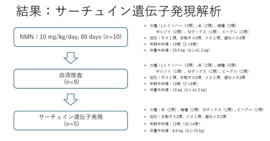 SIRT1遺伝子発現解析に必要な遺伝子が十分に回収できた5頭(去勢オス2頭、メス1頭、避妊メス2頭)においては、年齢中央値12歳(10~14歳)、体重中央値8.6kg(4.1~19kg)であり、NMN投与前と比較してSIRT1遺伝子の発現が増加しました。