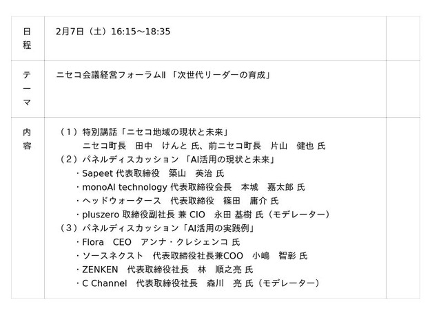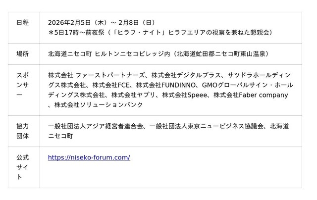 ニセコ会議事務局は、ウィンタースポーツを愛する上場企業を中心とした経営者80名以上が一堂に会し、「経営と日本の未来」について語る「ニセコ会議 2026」を、2025年2月5日から2月8日の期間、北海道ニセコ町で開催いたしますのでお知らせいたします。