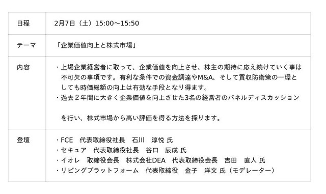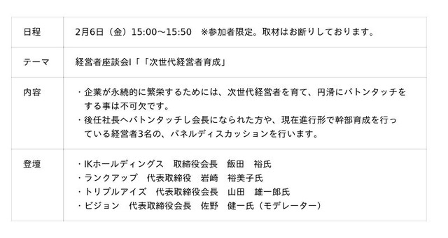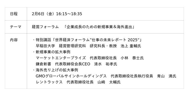 期間中、「次世代経営者育成」や「新規事業&海外進出」「企業価値向上と株式市場」「AI活用の現状と未来」などをテーマにした、フォーラムや座談会を開催いたします。報道陣の皆様におかれましては、是非ご取材・ご聴講いただけますようご案内いたします。