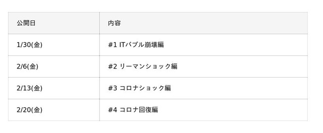 #1のテーマは「ITバブル崩壊」です。2000年代初頭、インターネット関連企業の株価が異常な高騰を見せた後、一気に暴落した激動の時代を取り上げます。