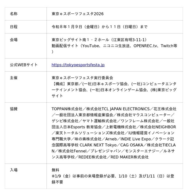 東京eスポーツフェスタ実行委員会は、eスポーツの普及と関連産業の振興を目的として、eスポーツの競技大会と関連産業展示会等で構成するイベント「東京eスポーツフェスタ2026」(以下「フェスタ」という。)を令和8年1月9日(金)~1月11日(日)の3日間にわたり開催しました。