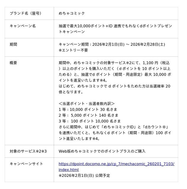 本キャンペーンの参加にはエントリーは不要で、キャンペーン期間中、めちゃコミック※1の対象サービス※2にて、1,100 円(税込)以上のポイントを購入いただく(dポイントを 10 ポイント以上ためる)と、抽選でd ポイント(期間・用途限定)最大 10,000 ポイントを進呈いたします※3。