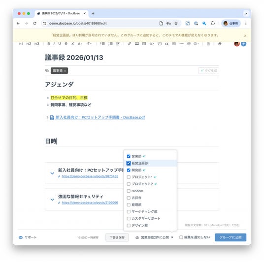 DocBaseでは、2025年11月にAI機能を追加費用なしで提供開始し、データを学習に利用しないことや、メモ単位での制御(no-aiタグ)など、セキュリティを重視した設計を行ってきました。しかし、「部門やプロジェクト単位でまとめて制御したい」というご要望を多くいただいておりました。