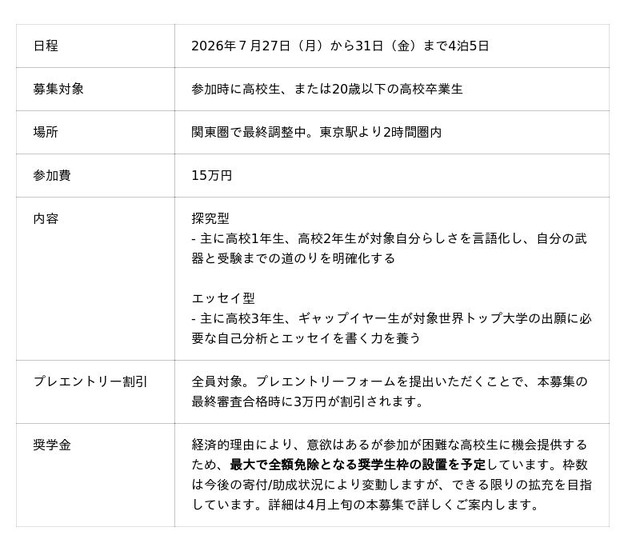 ※ギャップイヤー中で、進路が未確定の方も応募可能です。応募時点で、進学・合格可能性が最も高い大学・専攻を申告いただきます