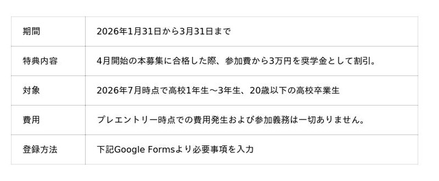本募集(4月上旬開始予定)に先立ち、意欲ある学生の参加を後押しできるよう奨学金キャンペーンを実施します。
