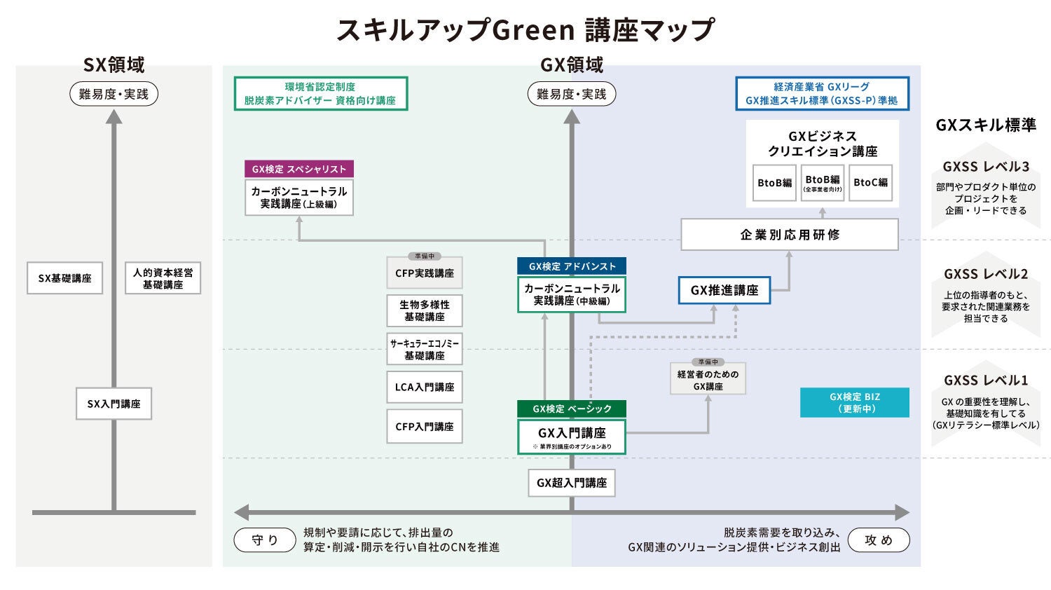スキルアップNeXtは、「スキルアップGreen」でGXを体系的に学べる講座や、GX推進に必要な知識やスキルを測る「GX検定」で企業のGX推進をワンストップでサポートしています。