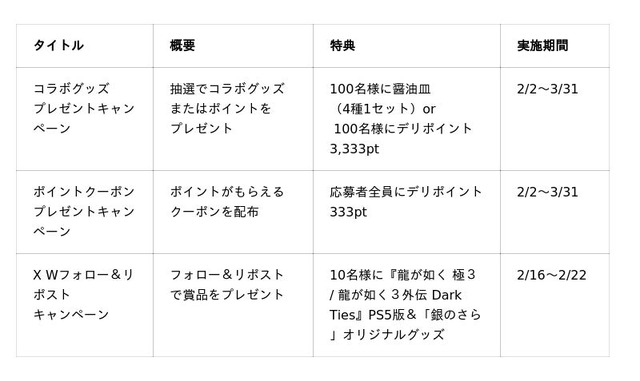 同コラボキャンペーンでは、『龍が如く』ゲーム内でおなじみのアイテムをイメージしたコラボ商品の販売のほかにも、同ゲームを代表するキャラクターをイメージしたコラボグッズを賞品とするプレゼントキャンペーンや、