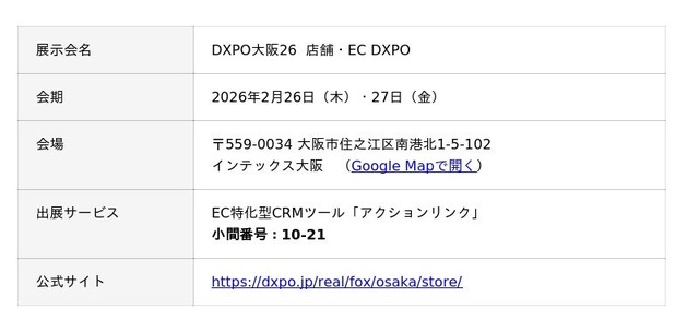 株式会社ファブリカホールディングスの完全子会社である株式会社ファブリカコミュニケーションズ(本社:愛知県名古屋市中区、代表取締役社長CEO:谷口政人)は、同社が提供するEC特化型CRMツール「アクションリンク」の取り組みとして、2026年2月26日(木)・27日(金)にインテックス大阪で開催される「DXPO大阪’26 店舗・EC DXPO【EC販促・開業支援展】」に出展し、あわせてEC事業者向けセミナーを開催します。