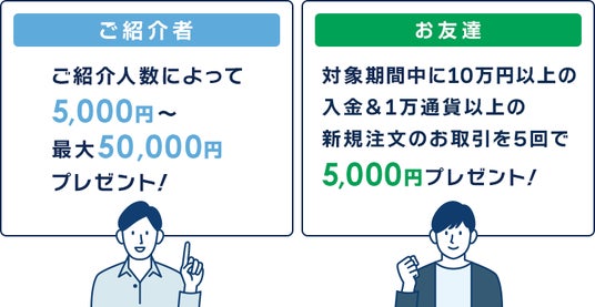 すでに『外貨ネクストネオ』を開設しているお客様(「ご紹介者様」)が、『外貨ネクストネオ』に興味をお持ちの方(「お友達」)を紹介していただき、後日その「お友達」が条件(『外貨ネクストネオ』にて10万円以上の入金(※1)、および1万通貨以上の新規取引を5回以上)を満たされた場合には、「ご紹介者様」と「お友達」の双方にもれなく現金5,000円をプレゼントいたします。