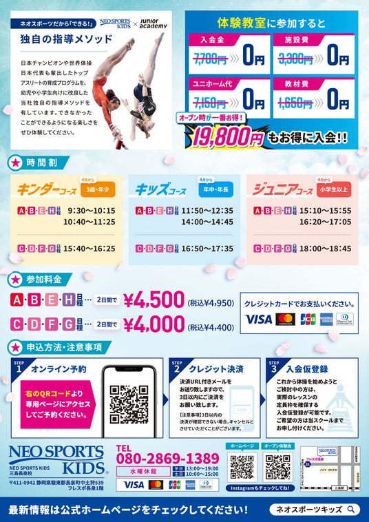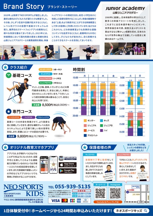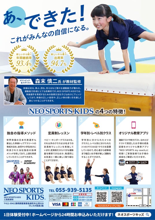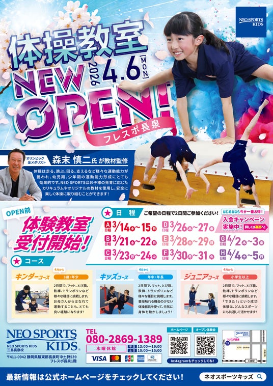子どもの運動不足や体力低下が課題となる中、子どもたちの一人ひとりの成長や運動能力向上に寄り添う体操教室「NEO SPORTS KIDS(ネオスポーツキッズ)」が、2026年4月に静岡県長泉町の商業施設「フレスポ長泉」に『NEO SPORTS KIDS三島長泉校』を開業します。