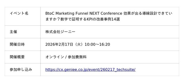 TechSuite株式会社(テックスイート/代表取締役: 畠山夏輝)は、2026年2月17日(火)に株式会社ジーニーが主催するオンラインカンファレンス「BtoC Marketing Funnel NEXT Conference 効果が出る導線設計できていますか?数字で証明するKPIの改善事例14選」に登壇します。