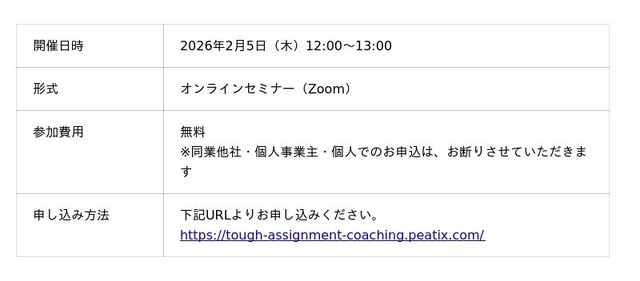本セミナーでは、最高のタフアサイメントとしての越境プログラムと、その経験を自組織の課題解決や活性化を推進する行動へ確実に繋げるビジネスリーダーコーチングの伴走モデルを提示。両社のソリューションを組み合わせることで、サクセッションプランの実効性を最大化させる具体策をお伝えします。