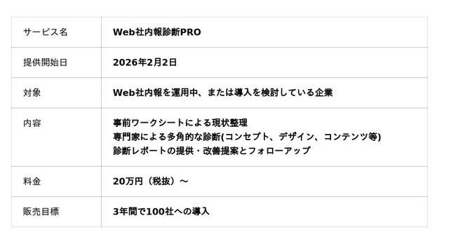 こうした課題を受け、SOLANOWAは、外部向け一般メディアで培ってきた、編集・分析・改善のノウハウを持つ専門アドバイザーと連携し、社内向けメディアに最適化した診断サービス「Web社内報診断PRO」を開発・提供開始しました。