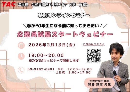 資格取得に向けた教育サービスを展開しているTAC株式会社(東京都千代田区、代表取締役社長:多田 敏男)では、公務員試験を検討されている新大学3年生へ向けて「春から3年生になる前に知っておきたい!公務員試験スタートウェビナー」を、オンラインで開催します。