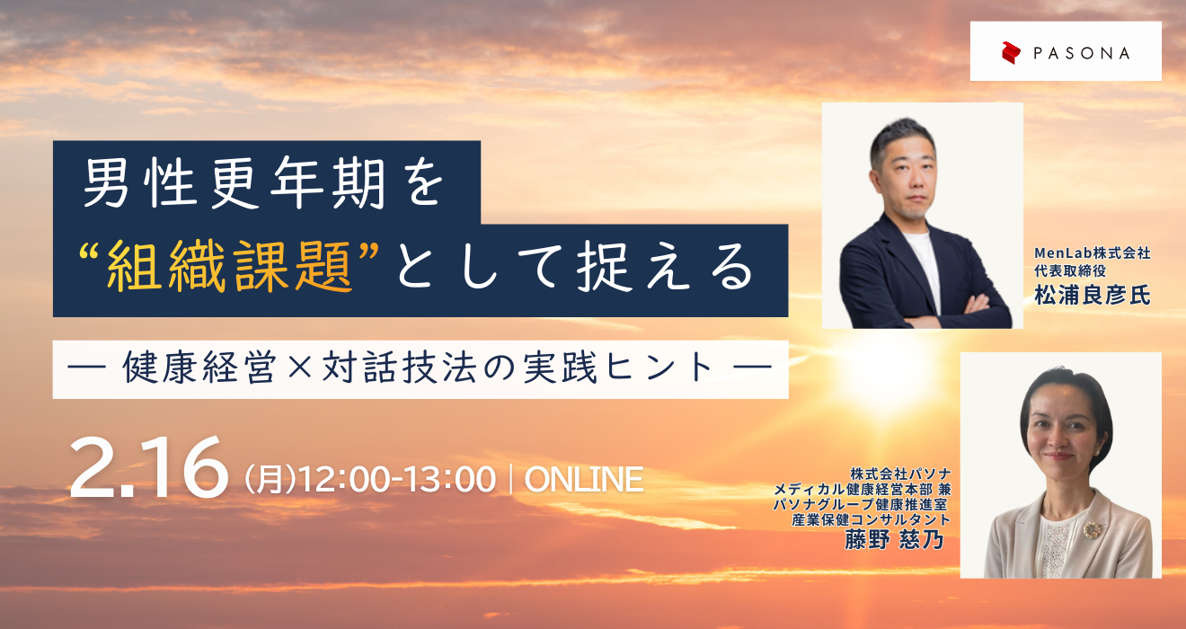 株式会社パソナは人事のご担当及び管理職層へ向けたウェビナー、「 男性更年期を“組織課題”として捉える― 健康経営×対話技法の実践ヒント ―」を2月16日(月)にオンラインで開催いたします。