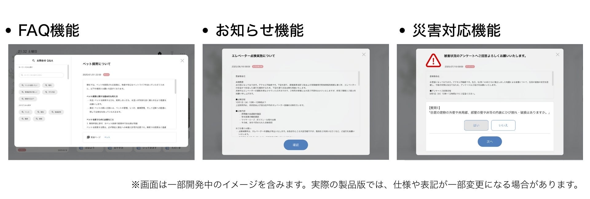 - 災害対応機能(開発中):安否確認や被害状況のアンケートを一斉配信し、電話が繋がりにくい状況でも迅速な情報収集を可能にします。点在する戸建ての運営において、初動対応の精度向上に寄与します。