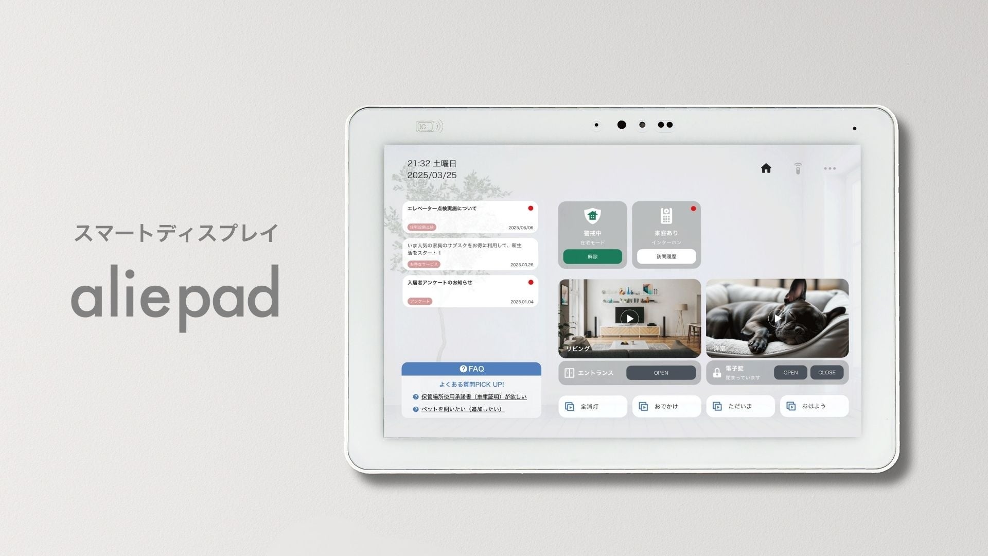 - お知らせ機能:郵送物や掲示物の作成・配布にかかる工数とコストを削減し、スマホおよび室内のaliepadへ一斉配信することで、情報の見落としや紛失を低減します。