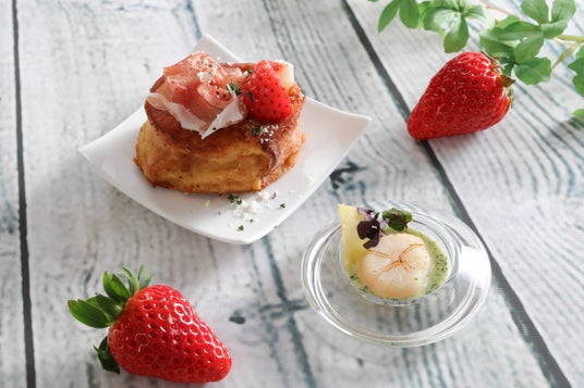 ・いちごと生ハムのパンペルデュ・サレ・北海道産帆立貝柱の炙り クリームピストーソース