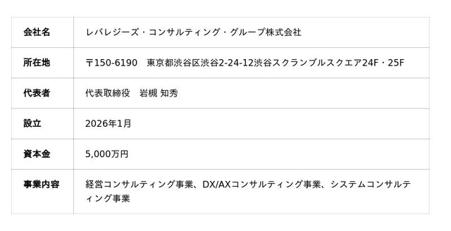 レバレジーズグループは、企業のDX/AXの実現に向け、戦略立案から実行までを一気通貫で支援する新会社「レバレジーズ・コンサルティング・グループ株式会社」を設立し、2026年2月3日(火)より事業を開始することをお知らせいたします。当社は、コンサルタントおよびエンジニアを含む100名規模の支援体制を構築し、今後3年間で600名超への体制拡充を予定しています。