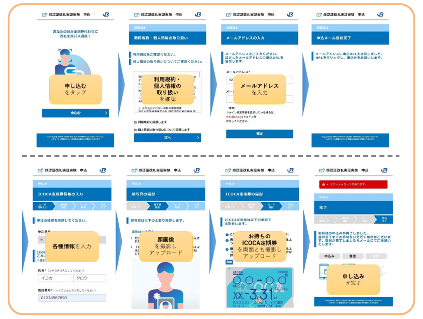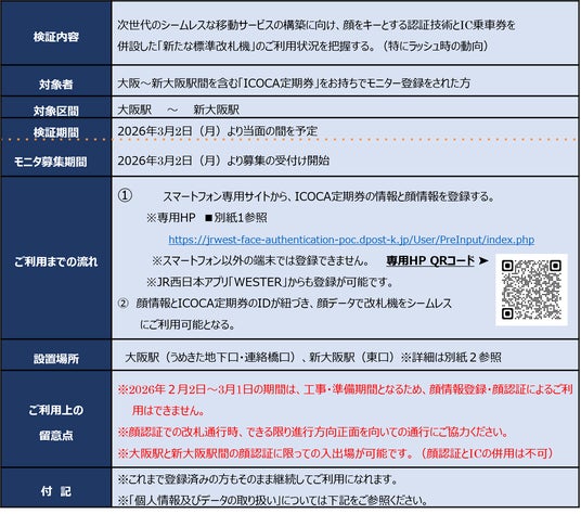 ・取得した個人情報は、「JR西日本のプライバシーポリシー」、「顔認証改札実証実験に関する規約」及び「個人情報の取扱いに関する同意書」に基づき、厳正に管理します。