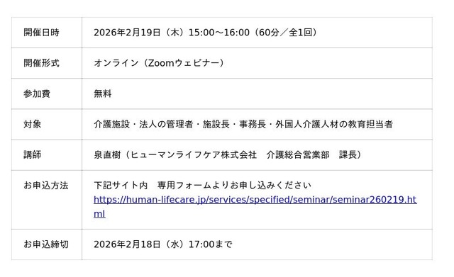 - インドネシア現地の教育機関とライブ中継で繋ぎ、学生の日本語力や介護への就労意欲などを確認できる無料オンラインセミナーを、2026年2月19日(木)15:00~16:00に開催