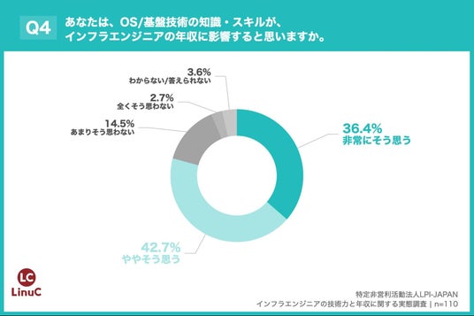 「Q4. あなたは、OS/基盤技術の知識・スキルが、インフラエンジニアの年収に影響すると思いますか。」(n=110)と質問したところ、「非常にそう思う」が36.4%、「ややそう思う」が42.7%という回答となりました。