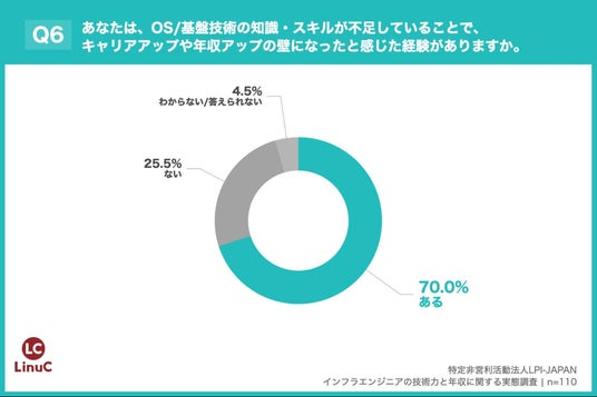 「Q6. あなたは、OS/基盤技術の知識・スキルが不足していることで、キャリアアップや年収アップの壁になったと感じた経験がありますか。」(n=110)と質問したところ、「ある」が70.0%、「ない」が25.5%という回答となりました。