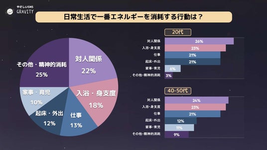 【生活の壁】 最もエネルギーを使う行動は「仕事」を抑えて「対人関係。トレンドにもなったことのあるいわゆる「風呂キャン」も上位、日常の動作が大きなハードルに。
