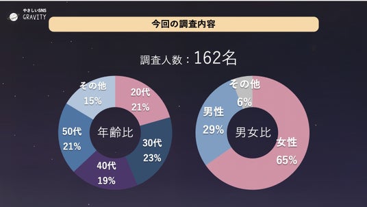 HiClub株式会社(本社:東京都港区、代表取締役社長:古谷由宇)が提供する、SNS「GRAVITY」(グラビティ)(iOS、Android版)は、同じ趣味や境遇同士のユーザーで集まれるコミュニティ機能「惑星」のユーザーにアンケートを実施。