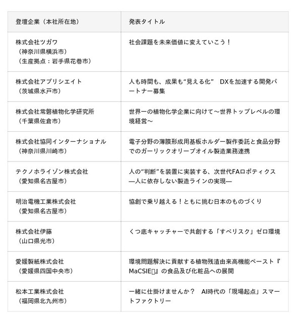 今回のイベントでは、未来企業等9社(関東地域からは茨城県、千葉県、神奈川県の企業3社)が様々なニーズを発信し、提案企業を募集・マッチングへと繋げ、共創・協業の実現を目指します。
