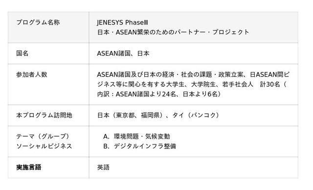外務省が推進する「日本・ASEAN繁栄のためのパートナー・プロジェクト」は、日本とASEANの将来を担う次世代人材が、アジア地域の持続的な繁栄に向け共通する社会課題の解決を目指し、協同してビジネスプランを作成すること、またそれを通じて若い世代間で相互理解を深め、パートナーシップを強化することを目指すプログラムです。