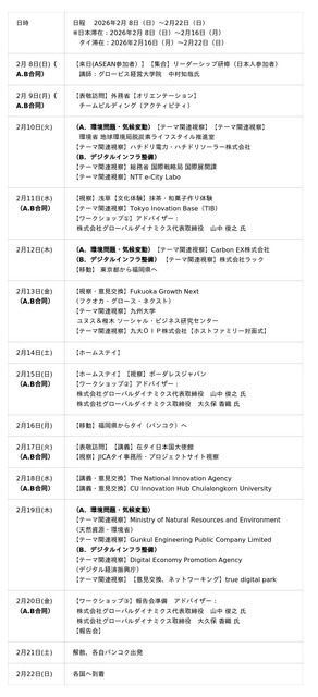 参加者(30名)は、約2週間にわたり、寝食を共にしながら学び、議論をします。まず東京および福岡で日本の社会課題への取り組みやソーシャルビジネス支援について学びます。また、日本の文化や生活も体験し、理解を深めます。そしてタイ・バンコクに渡り、タイをはじめとするASEANの社会課題やそれに対する取り組み・支援を学びます。そして「環境問題・気候変動」と「デジタルインフラ整備」の2グループに分かれてディスカッションをし、知見や議論を深め、それぞれの課題を解決するソーシャルビジネスプランを考え、報告会で発表します。
