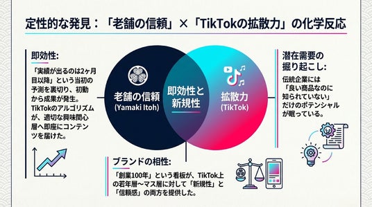 本プロジェクトでは、これまで卸売(BtoB)を主軸としていたヤマキいとうに対し、当社の強みであるTikTok分析ツールを用いた戦略的な運用を実施。その結果、運用初月から60個以上の販売を記録し、1投稿目から即座に売上が発生するという、伝統企業の新たな販路拡大において極めて高い初動成果を収めました。