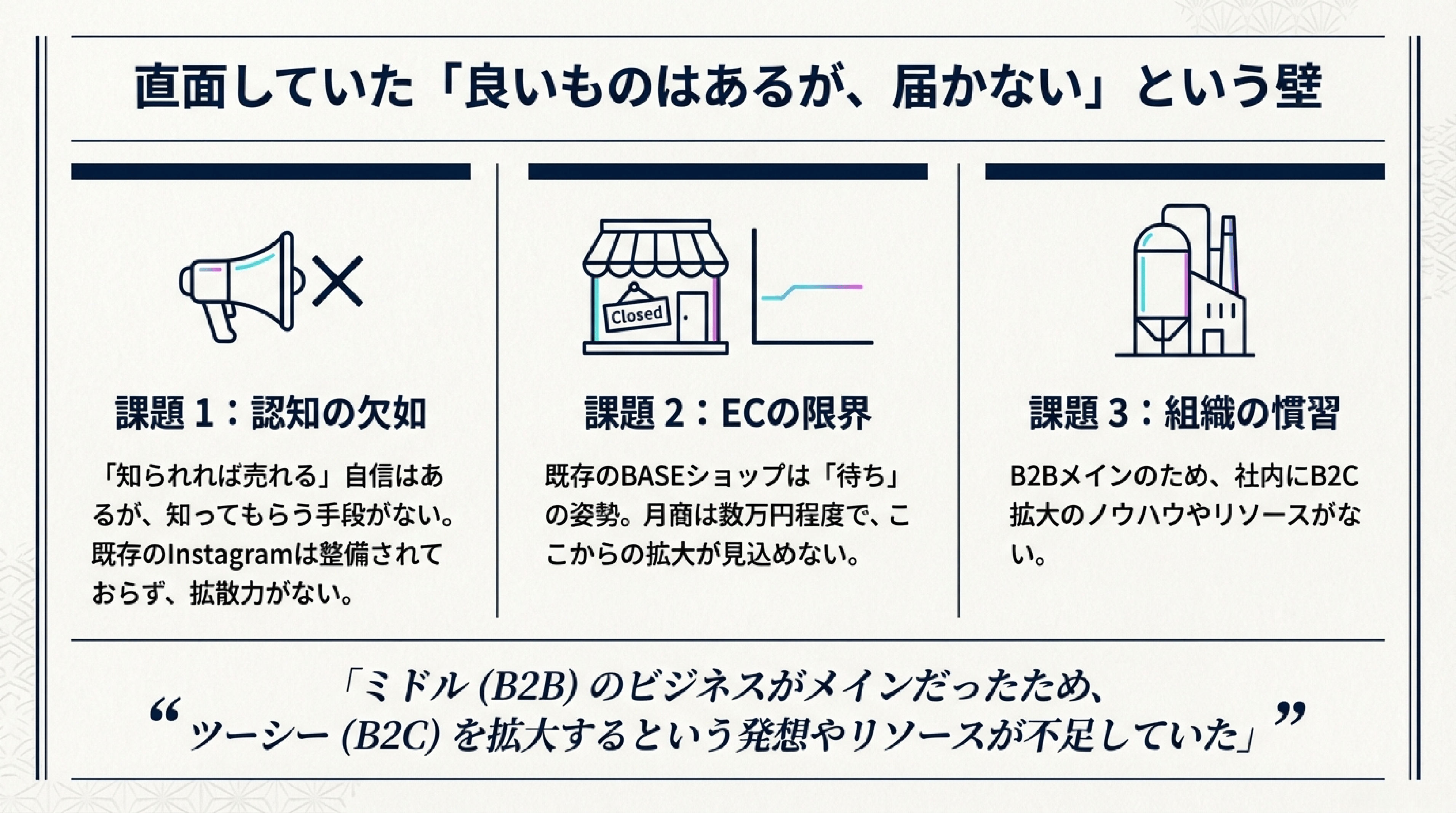 ヤマキいとうは、100年の歴史を持つ確かな品質の商品を扱っている一方で、消費者への直接販売(D2C)においては、ECサイトやホームページの整備が十分ではないという課題を抱えていました。既存のSNS(Instagram等)も身内向けの案内が中心となっており、新規顧客の獲得に繋がる運用が急務となっていました。